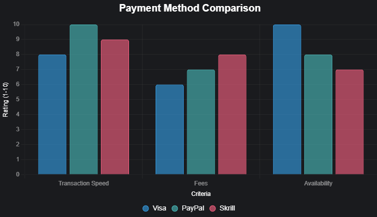Visa is renowned for its reliability and widespread acceptance, but alternatives like PayPal and Skrill offer unique benefits tailored to player needs. The table below compares Visa, PayPal, and Skrill by transposing the criteria as rows and payment methods as columns to highlight differences in transaction speed, fees, and availability.